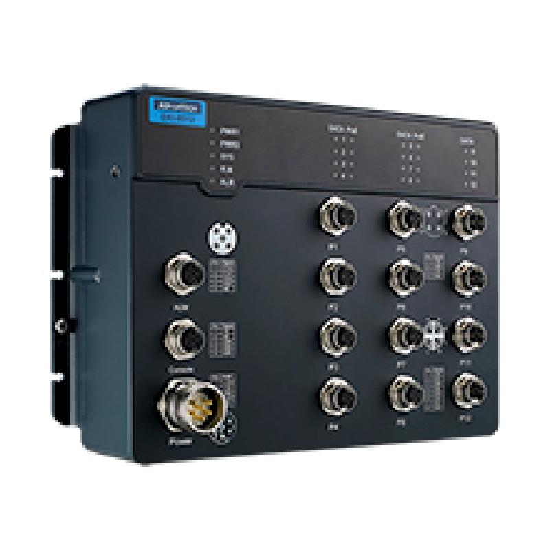 - 8 x M12 D-Coded 10/100 Mbps PoE ports + 4 x M12 X-Coded 10/100/1000 Mbps ports